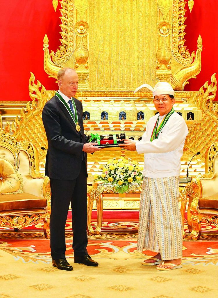 စစ်ခေါင်းဆောင်ကလည်း ရုရှားနိုင်ငံလုံခြုံရေးကောင်စီ အတွင်းရေးမှူး Mr. Nikolai PATRUSHEV ကို သရေစည်သူဘွဲ့ ပြန်လည်ပေးအပ်လိုက်သည်။ ရုရှားနိုင်ငံနှင့် မြန်မာနိုင်ငံတို့ ပိုမိုနီးကပ်အောင် စွမ်းစွမ်းတမံ တည်ဆောက်နိုင်ခဲ့သောကြောင့် ထိုဘွဲ့ ချီးမြှင့်သည်ဟု ဆိုသည်။