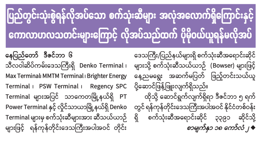 စစ်ကောင်စီလက်အောက်တွင် စက်သုံးဆီပြတ်လပ်မှု မကြာခဏ ဖြစ်ပေါ်လျက်ရှိသည်။ ၂၀၂၂ ဧပြီ၊ သြဂုတ်နှင့် ဇွန်လများ၊ ၂၀၂၃ တွင် အောက်တိုဘာ၊ နိုဝင်ဘာနှင့် ယခုလ ဒီဇင်ဘာတို့တွင် စက်သုံးဆီဆိုင်များတွင် ဆီပြတ်သွားခဲ့ပြီး အကန့်အသတ်ဖြင့်သာ ရောင်းချနိုင်ခဲ့သည်။