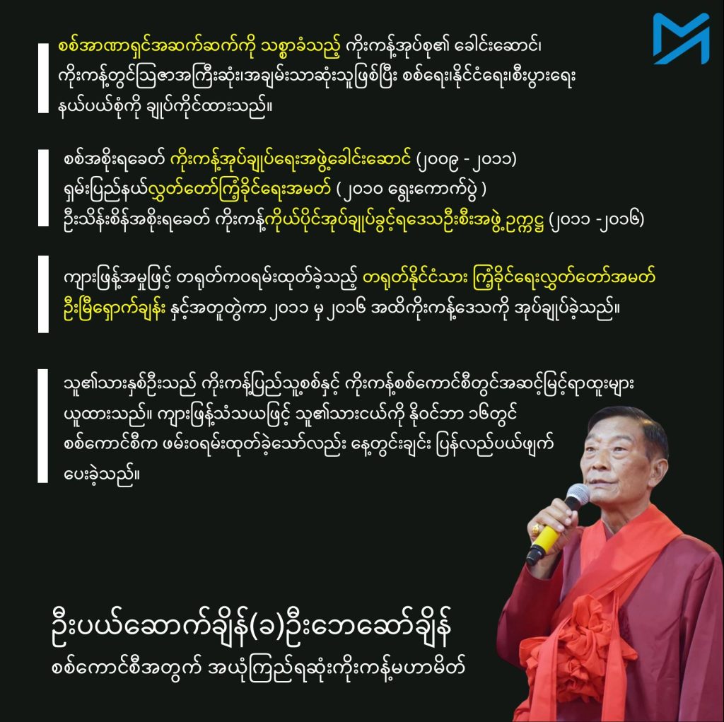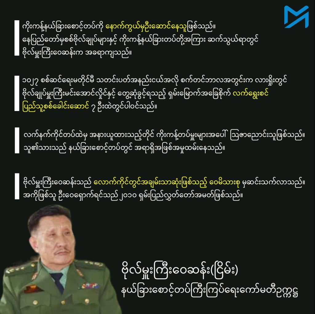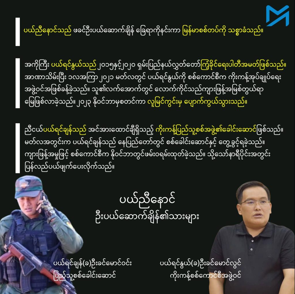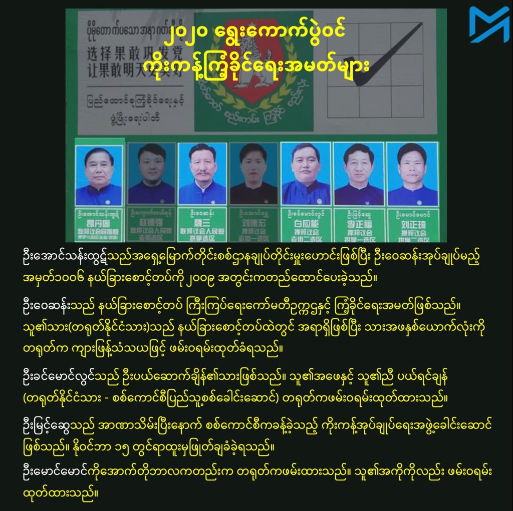 စစ်ကောင်စီကို သစ္စာခံသည့် ကိုးကန့်အုပ်စုထဲတွင် ၎င်းတို့သုံးဦးနှင့် ပြီးခဲ့သည်လအတွင်းက သေဆုံးသွားသည့် တရုတ်နိုင်ငံသား ကြံ့ခိုင်ရေးအမတ် ဦးမြီရှောက်ချန်းတို့သည် အရေးအပါဆုံးခေါင်းဆောင်များဖြစ်သည်။