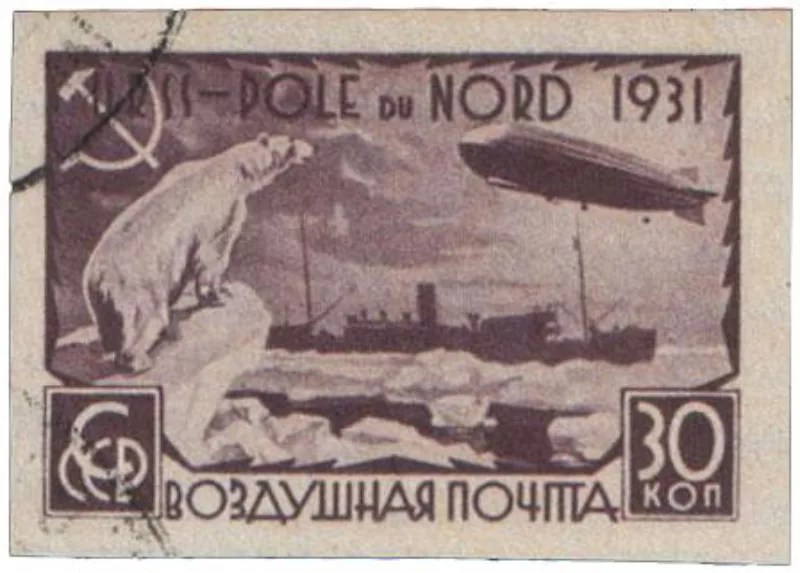 Правда, в последний момент выяснилось, что подводной лодки, которую готовил к арктическому походу австралиец Хьюберт Уилкинс, не будет. Списанная американская субмарина времён I мировой войны, которую он где-то прикупил по дешёвке, безнадёжно сломалась, едва доплыв до Шпицбергена. Хорошо ещё, что не утонула! Поэтому на марках советскому художнику нужно было срочно всё переделать — и, убрав подводную лодку, он посадил «для композиции» на её место белого медведя.