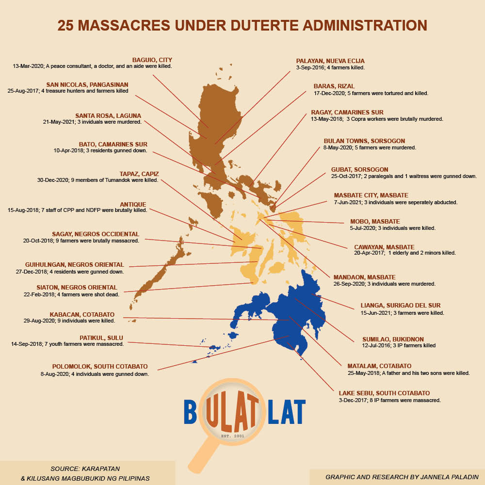 MANILA – Human rights alliance Karapatan documented 25 massacres with 120 individuals killed since Duterte assumed office 2016 until June 2021.