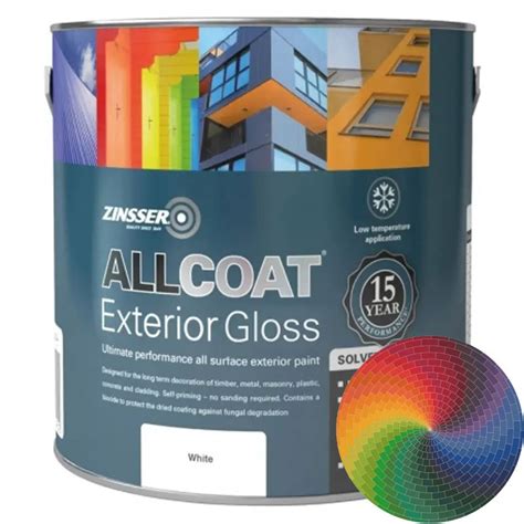 Zinsser Allcoat Solvent Based . Zinsser allcoat® exterior satin (solvent based) is an ultimate performance all surface paint. We would advise creating a light key for the solvent based paint to adhere.