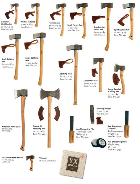 57 of the 122 axe types listed in this article. The majority of throwing axes are modest in size, but have a longer grip and a sharp blade. Felling axe the classic long axe you see lumberjacks hauling into the woods.