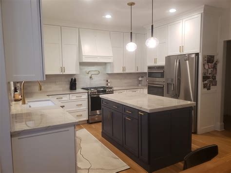 Beveled Shaker, Arctic White & Charcoal Blue, Range Hood, from blog.freshfacedcabinets.com