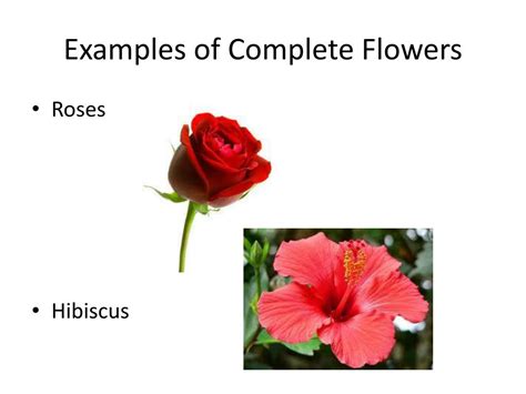 Complete Flower Examples - From the base of the receptacle upward these four organs are the sepals, petals, stamens, and carpels. A complete flower is composed of four organs attached to the floral stalk by a receptacle (figure 11). Examples of complete flowers include hibiscus and tulips. A flower having all of the main floral parts (sepals, petals, pistils, and stamens) is said to.