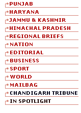 | | Punjab | Haryana | Jammu & Kashmir | Himachal Pradesh | Regional Briefs | Nation | Editorial | | Business | Sport | World | Mailbag | Chandigarh Tribune | In Spotlight | 50 years of Independence | Tercentenary Celebrations | | 120 Years of Trust | Calendar | Weather | Archive | Subscribe | Suggestion | E-mail | |