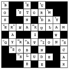 Across 4. Violent disturbance in the atmosphere 6. Follows the night, as they say 8. Well known town in South India 11. Movements in a circle or spiral, etc. 16. Cry, weep loudly 17. Escape; dodge