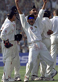 A tense Warne, with five players close around him, played forward tentatively and Sadagopan Ramesh latched on to a low catch at forward short leg sending the spectators into a frenzy. But the young spinner’s moment of glory had to wait for a while as umpire S.K. Bansal referred the catch to the third umpire. There was pin drop silence in the ground before the red light flashed, signalling Harbhajan’s entry into the record books. At stumps, Steve Waugh stood amidst the ruins with a brave 29 while Jason Gillespie was giving him company with six. After they won the toss and elected to bat, the Australian opening pair provided a solid foundation by stitching 103 runs as the Indians allowed them to settle down early in the innings by bowling a number of loose balls. Just when the partnership was assuming dangerous proportions, Zaheer Khan provided the vital breakthrough by getting rid of Slater shortly after the lunch break much to the delight of the huge holiday crowd who had very little to cheer in the pre-lunch session. Slater, who invited ICC match referee’s wrath by commenting on his controversial catch of Rahul Dravid in the Mumbai Test, could add just one run to his lunch tally before flashing at an away going delivery to Nayan Mongia behind the stumps. The hosts had themselves to blame for allowing the Aussie openers to flourish as the script would have unfolded differently if the Indians could latch on to the catches that came their way. Dravid dropped a fairly easy catch of Hayden at first-slip when he was on 67 while Tendulkar spilled a rather difficult chance of Justin Langer at the mid-wicket region to let the visitors off the hook early in the proceedings. Langer, who joined the action after Slater’s dismissal, gave able support to the hard-hitting Hayden as the duo put on 90 runs for the second wicket to consolidate the position for the visitors. Hayden was particularly severe on the spinners who failed to check the run flow as the post-lunch session yielded a brisk 105 runs to leave the hosts a demoralised lot. The last session, however, saw a dramatic turn-around due to Harbhajan’s hat-trick. Harbhajan Singh produced the dream spell to virtually turn the match on its head and leave the visitors gasping at 252 for seven after being comfortably placed at 214 for two at one stage. The hosts got rid of Mathew Hayden (97), Justin Langer (58), Mark Waugh (22), Ricky Ponting (6), Adam Gilchrist (0) and Shane Warne (0) in quick succession to shatter Australian hopes of a big first innings total. The departure of Hayden, who fell three runs short of what could have been his second consecutive century, opened the floodgates as Harbhajan Singh suddendly looked a totally different bowler showing excellent control. Scoreboard Australia (1st innings): M Slater c Mongia b Z Khan 42 M Hayden c sub (Badani) b H Singh 97 J Langer c Mongia b Z Khan 58 M Waugh c Mongia b H Singh 22 S Waugh batting 29 R Ponting lbw b H Singh 6 A Gilchrist lbw b H Singh 0 S Warne c Ramesh b H Singh 0 M Kasprowicz lbw b Ganguly 7 J Gillespie batting 6 Extras (b 11, lb 7, nb 6) 24 Total (for 8 wkts) 291 Fall of wickets: 1-103, 2-193, 3-214, 4-236, 5-252, 6-252, 7-252, 8-269. Bowling: Zaheer Khan 18.4-4-55-2, Venkatesh Prasad 21-5-69-0, Ganguly 10.2-2-31-1, Raju 15-2-49-0, Harbhajan Singh 24-6-66-5, Tendulkar 1-0-3-0.