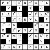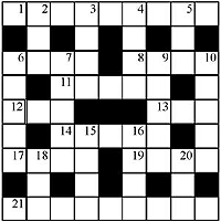 Across 1. Ruler, monarch 6. The den of a wild animal 8. Pertaining to Africa 11. Semi-precious stone 12. Public transport 13. Linking word, conjunction 14. Another name for magnesium sulphate 17. River in Central Italy 19. Change direction 21. Stubborn