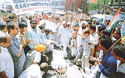 Diwan, Chairman, Urban Development Cell of Indian Youth Congress. The speakers said the party rally to be held on April 11 would focus on “corrupt governance” of NDA Government and the failure of SAD-BJP government in Punjab. Meanwhile, Congress activists of Amloh constituency staged a protest march in the main bazars of Amloh today against the NDA government. A rally was also organised in tehsil Effigies of Mr Parkash Singh Badal, Chief Minister, Punjab, Mr Bangaru Laxman and Mr George Fernandes were burnt. Earlier, a seminar and rally was organised by Dr Sikander singh president of the District Congress Committee, Fatehgarh Sahib at Mandi Gobindgarh near here which was addressed by Mr Jai Kishan Saini former minister and observer sent by Punjab Pardesh Congress Committee. |