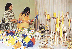 Candle stands and bone china crockery on display at an exhibition in Ludhiana on Friday.