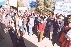 Mahasabha men hold demonstration Kangra, January 4 The demonstrators were led by the state chief of All India Hindu Mahasabha, Mr Nalinder Ghautam, he set the effigies on fire. Mr Ghautam demanded that people, particularly ex-servicemen should be provided with arms to face militants. He demanded that all Muslims visiting Himachal from Jammu and Kashmir and UP and Bihar should be scrutinised. Two girls Kaitki and Juhi Kulkarni, both Hyderabad, who were in the town to pay obeisance to the Bajreshwari temple, presented glass bangles and ribbons to Mr Ghautam to be sent to the Prime Minister. |