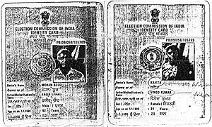 | The voter’s I-cards issued in 1996 to Mr Sood and his daughter carry several mistakes. |
