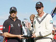 Adams stars in Kiwi victory Captains Nasser Hussain of England, left, and Stephen Fleming of New Zealand pose with the tour trophy after the last day of the third cricket