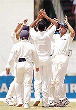 33 (b-1 lb-4 nb-25 w-3) Total: (5 wkts, 143 overs): 454 Fall of wickets: 1/20, 2/37, 3/44, 4/157, 5/450. Bowling: Srinath 29-7-79-3, Khan 29-8-92-1, Bangar 23-5-60-0, Kumble 36-6-118-0, Ganguly 2-1-2-0, S.Singh 21-5-80-1, Tendulkar 3-0-18-0.