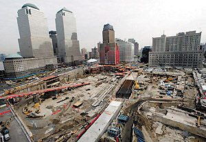 The former site of the World Trade Center, known as "ground zero," is seen from the southeast in this photo taken on June 4, 2002. The emotional debate over what should replace the complex, destroyed in the September 11 attacks, has become one of the most democratic urban projects in history.— Reuters