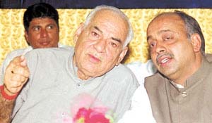 Delhi BJP president Madan Lal Khurana with Union Minister Vijay Goel at the