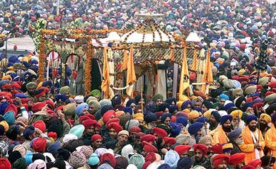 A religious procession carrying the ‘Sri Guru Granth Sahib’, makes its way towards the gurdwara in Fatehgarh Sahib on Friday. Reuters photo