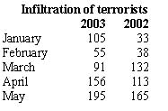 Infiltration on rise As per the official figures, there were 105 incidents of infiltration from across the LoC in January this year, 55 in February, 91 in March, 156 in April and 195 in May. The figures for the corresponding period last year were 33 (January 2002), 38 (February), 132 (March), 113 (April) and 165 (May). The months during which the infiltration had been minimal was because of heavy snowfall in this period which led to closure of mountain passes. Sources in the government told The Tribune today that going by this trend infiltration would be on further upswing in the coming months as well. Central agencies kept a close tab on the infiltration figures on a day-to-day basis. Their inputs came from eyewitness accounts of the locals, discovery of footprints by patrol parties, interrogation of captured militants as well as surveillance of wireless conversations of militant outfits based in Jammu and Kashmir with their bosses sitting across the LoC. Since each of over six major Central agencies, including the Intelligence Bureau (IB), Research and Analysis Wing (RAW), Military Intelligence (MI) and Border Security Force (BSF) maintained their own accounts of infiltration, quite often the overall figures varied. However, the variation was minor and the Government of India stuck to one set of figures for official purposes. The Vajpayee government had been raising the issue of infiltration with the international community. Significantly, the government had been working in tandem with Israeli experts in tackling the problem of infiltration and had imported electronic equipment, sensors and other hi-tech gadgets from Tel Aviv. In this context, the meeting of Israeli Foreign Minister Sylvan Shalon’s Special Envoy, Mr David Ivry, with Deputy Prime Minister L K Advani here today assumed significance. It was understood that Mr Advani and Mr Ivry discussed the Israeli strategic cooperation on making the LoC infiltration-proof. Mr Ivry would be meeting External Affairs Minister Yashwant Sinha tomorrow and Prime Minister’s Principal Secretary and National Security Adviser Brajesh Mishra the day after, sources said. |