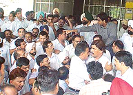 back as Bar Association chief Mr Harish Rai Dhanda argues with the police over the case lodged against his supporters outside the Division No. 5 police station, Ludhiana, in the wee hours of Friday; and (right) the general body meeting of the District Bar Association gets stormy in New District Courts, Ludhiana, on Friday.