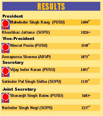 of his supporters included senior PUSU workers who deserted the Kang group because of personal differences. This category was only interested in the ouster of Kang from the office and their support never attempted at projecting Sandhu as a fit candidate. Sandhu apparently spent “plenty” on the poll, which seems interesting as he could not find even a single candidate to stand with him for other posts of the council. It is also worth pointing out that his car rally was the most impressive one, with 47 vehicles in the campaign. There were a number of college students in his camp as well. The Akhil Bharatiya Vidyarthi Parishad this time had the brightest chance on the campus. Understanding the absence of major alliances this time, the ABVP spent a sizeable amount of money on the poll. The camp also had a large number of outsiders. The ABVP struck a poll alliance with the HPSU in an attempt to attract the vote bank of students from Himachal Pradesh. The Himachal group broke into two new alliances, nullifying the potential of impact, if any. Regional character plays a crucial role during elections in the university. The university is dominated by Punjabis, which is substantiated by the fact that each year PUSU and SOPU poll maximum number of votes. The Haryana students who combined under the HSA banner were claiming more than 1,200 voters. However, they bagged only 442. Saurabh Joshi, despite being a popular figure, could not attract many votes because the organisation is known largely for its political lineage. The Haryana Student Association, at a late-night meeting, discussed the reorganisation of the group and there was also a suggestion to do away with the stress on “Haryana” in the organisation. Lifting voters is another interesting aspect of the polling scenario that occurs every year. This year was no exception. The most affected are the students of Chemical Engineering and the University Institute of Engineering and Technology. These are the youngest inhabitants of the campus. They are either “bribed” for movie shows, taken for outing or threatened to leave the campus. There is no real agenda for any organisation. It is just that the printed material spells a volume. There is near unanimity in accepting the fact that the material was just a gimmick, which had “no impact on the voters”. The campaign is a war of words in voicing allegations and counter-allegations. Issues like education, particularly in context with job scenario for the students, rarely find a mention. The open house by candidates at a common platform is a big “hoax” and the university has done little to increase its utility for the past six-years. The same trend was witnessed this year. Not a single person among the audience lent an ear to those on stage. However, there were certain positive trends as well. The expenses on the poll material were on the lower end compared with the past. The police role in handling certain unpleasant situations also deserves a mention as the campus remained largely calm.