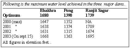 mark A good rainfall this season meant the dams were filling at a fast pace. However, the backlog or depletion of water from the reservoirs in the past few years was so huge in volume that the water will remain below the optimum level. Of the three major dams — The Bhakhra, the Pong and the Ranjit Sagar — the last one may be the worst hit. Today, the level was 1695 elevation feet (506 elevation metres ). This is about 44 feet below the optimum. As on date, the level in the Pong Dam is at 1363 elevation feet which is 27 feet below the optimum. It is the level in the Bhakra dam that had brought smiles back on the faces of irrigation engineers. The level in the mammoth 140 sq km reservoir was at 1668 elevation feet. This is projected to go up to atleast 1672 elevation feet. This is the best since 1998 when the level was 1682. At Bhakhra, it is not just a question of the reservoir falling short from the brim by a few feet. The reservoir is V-shaped and the filling of the upper portion takes a long time. A shortfall of about 10 feet near the brim can translate into a huge amount of water. It can meet water requirements for about 45 days. Interestingly it will be the fifth year in succession that the Bhakhra and the Pong dams will not be full to the brim while the Ranjit Sagar dam , located on the Ravi river had never filled to the brim since the filling started late in October, 2000. Starting from the winter of 1998-1999, the cycle of snow and rain during the monsoon has not been smooth. It has either rained less than expected or the snow has been insufficient. The two dams are fed through glacial snow melts and rain during the summer and the monsoon, respectively. The three dams contribute in a major way to meet the irrigation requirements of Punjab, Haryana and Rajasthan. There has not been such a long successive period when the dams have not filled since the Bhakhra came up 40 years ago and since the Beas was tamed by a dam at the Pong almost 30 years ago. |
