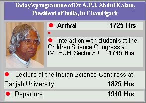 900 cops take part in drill for Kalam’s visit Unclear about whether the President will come by train or air, the Chandigarh police has made arrangements for both. During the rehearsal, security personnel were deployed both along the railway station and technical airport routes. Sources in the Railways said the option of travelling by train has been kept as a contingency plan as fog might play a spoilsport. If the fog does not allow the flight of the President, he might come by his special saloon equipped with five-star facilities. The Railways keeps special saloons for the President and the Dalai Lama. These saloons are even better than that of the Railway Minister, sources said. The Chandigarh railway station has been informed of the possibility of the President travelling by train, sources said. Considering the land route
