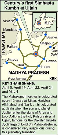 Mahant Paramanand Saraswati of the Joona Akhara performed puja of the Kshipra with great fanfare at Datt Akhara area at 5.40 am. After that sadhus were granted permission to enter the river for the auspicious bath. Scores of akharas, camping on the outskirts of Ujjain for the entire Kumbh period, were allotted time and place for the holy bath after consultation. By a strange tradition, the ordinary mortals are not permitted to go near the river till all sadhus belonging to various akharas have taken bath and returned to their camps — that is some time after noon. A slight change, however, was made this year and a limited number of common people were permitted to take bath in the river in the Datt Akhara area after 8 am, according to official sources. An estimated 15 lakh persons took bath on the first “shahi snaan” of the Kumbh, locally known as Simhastha, today. As many as three lakh of them were said to be sadhus. The administration is not taking any chances. Strict checking of the vehicles moving towards Ujjain is being done. While, PWD minister Kailash Vijayvargiya, who is in charge of the Simhastha, has been camping in Ujjain and personally supervising the arrangements, chief minister Uma Bharati has been keeping in constant touch with the goings-on in Ujjain from Bhopal. Meanwhile, according to a PTI report following the royal tradition, scion of the Scindia family Rajast (an Chief Minister Vasundhara Raje was among the first to have a holy dip in Kshipra just past midnight. While the sadhus bathed at the main Ram Ghat and Dutt Akhara ghat, other people were allowed to take dip in the river at the 28 newly constructed and 13 ghats renovated for the month-long mela. The Shaiva sect sadhus of Juna, Niranjani, Anand,