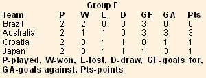 Japan, coached by former Brazilian all-star Zico, desperately needs to win in Dortmund to keep its chances of advancing alive. A draw will automatically send the Japanese back home. “We’re playing the best team in the world and that's exciting but obviously we have to win,” said Alessandro Santos, a Brazilian native who has taken Japanese citizenship. Besides beating the five-time champions, Japan needs to hope Australia fails to defeat Croatia in the other Group F match tomorrow. Japan lost 3-1 to Australia in its opener, then drew Croatia 0-0. Aussies seek win against Croatia