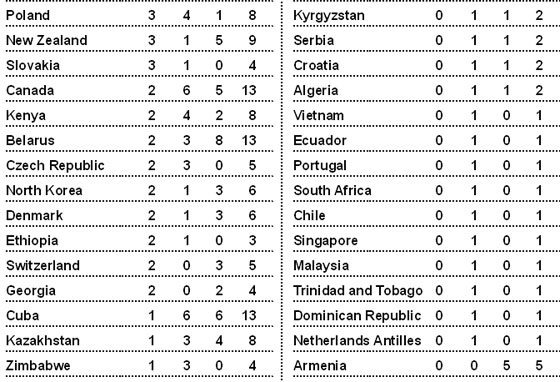 Beijing, August 20 He repeated the performance in the highlight of Day 11 of the Beijing Games when he equalled the illustrious American with a commanding win and world record time of 19.30 in the 200m. Nine men have now won the double sprint in Olympic history. The hosts, who came second to the United States in Athens 2004, have 45 gold medals, a seemingly unassailable lead that marks their emergence as an Olympics superpower. That will delight the Communist government, for whom the $43 billion Games are a symbol of China's new global standing. Local windsurfer Yin Jian pumped and glided her way to a first sailing gold for China. Wu Jingyu won gold in women's taekwondo on another successful day for hosts. The United States lie second with a less-than-expected 26 golds, while next Olympics hosts Britain are a surprising third with 16 golds, their best showing in a century. Global conflict zones like Iraq, Somalia, Afghanistan and the Palestinian territories struggled to send athletes to China, and some competitors had to prepare in appalling circumstances. Swimmers have used under-size public pools, while runners have had to dodge bullets. Against all odds, though, Rohullah Nikpai won the first Olympic medal in Afghanistan's history -- a taekwondo bronze. “I’m very happy,” said Nikpai, who fell to his knees, hugged coaches and wept after beating world champion Juan Antonio Ramos. In the first Olympic 10 km open water swim, Russia's Larisa Ilchenko won by less than two seconds from Britain's Keri-Anne Payne and Cassie Patten, sprinting past the pair in the last 100 metres of the jostling, rough-and-tumble contest. South Africa amputee Natalie du Toit won admiration for her pluck in swimming the 10 km but there was no medal for the 24-year-old, who lost her left leg in a motorcycle accident in 2001. She finished 16th, around a minute behind Ilchenko. As well as the water race, TV-friendly BMX biking got its first start, bringing some counter culture attitude and extreme sports buzz to the Summer Games. To the sound of thumping music, bikers race down a three-storey start ramp, fly over rolling dirt bumps in helmets and protective padding, and crash their tiny bikes recklessly in action-packed races that last less than 40 seconds. “Being a fast, intense spectator sport, it suits young people’s expectations,” said France’s Anne-Caroline Chausson, who crashed but made it into the semifinals. Less attractive to sports fans, however, was news that Ukraine's heptathlon silver medallist tested positive for steroids. Lyudmila Blonska could be kicked out when IOC officials meet on Thursday to review the latest doping case.