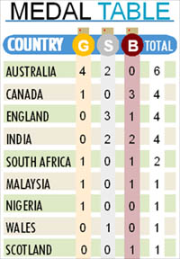 Otherwise it was a mixed day for the home team as its tennis and squash players made impressive starts with swimmers putting up an inspired performance in the five gold medal events decided today. Australia has won four of eight medals on stake today while the remaining four have been shared by South Africa, Canada, Malaysia and Nigeria. Malaysia and Nigeria got it in weightlifting for men (6=56 kg) and women (48), Canada and South Africa got one each in aquatics. Australia won thre gold in aquatics besides the gymastics artistic team championhsip for men. With two silvers and as many bronze medals, home team appeared somewhat satisfied though it was expecting a dreamy golden start of its campaign in the 11-sporting extravaganza that got off to scintillating start after a glittering opening ceremony on Sunday.