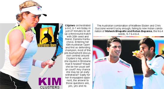 Melbourne, January 18 Nadal beat German veteran Tommy Haas 6-4, 6-3, 6-4 in a 2 1/2-hour match, declaring that the twisted tendon in the heavily taped knee was not a concern. Just before Federer was due on Hisense Arena, the Swiss found out that his scheduled opponent, Germany's Andreas Beck, had a back injury and had to withdraw. Top-seeded Novak Djokovic and fourth-seeded Andy Murray, the threats from the other side of the draw, play their second-rounders tomorrow. Two of the women's title contenders, defending champion Kim Clijsters and No. 1 Caroline Wozniacki, both won their second-round matches today on their way to a potential quarterfinal meeting. French Open champion Li Na also advanced, defeating Olivia Rogowska of Australia 6-2, 6-2. She could meet Clijsters in the fourth round in a rematch of last year's final at Melbourne Park. Clijsters needed only 47 minutes to beat Stephanie Foretz Gacon of France 6-0, 6-1 and Wozniacki defeated Anna Tatishvili of Georgia 6-1, 7-6 (4). Clijsters said she doesn't give a lot of thought to who she'll face down the road of any tournament. "That's something that I definitely learned since I was younger ... the media people always start to talk about the future, quarterfinal, semifinal, a tough third, fourth round coming up before the tournament even starts," the Belgian veteran said. "I don't like to waste my energy on those kind of thoughts." Elsewhere on the women's side, 10th-seeded Francesca Schiavone was eliminated 6-4, 6-3 by fellow Italian Romina Oprandi and No. 16 Peng Shuai of China lost 6-2, 6-4 to Iveta Benesova of Czech Republic. Former No. 1-ranked Jelena Jankovic beat Chang Kai-chen of Taiwan 6-4, 6-2. Eighth-ranked Mardy Fish became the first top 10 player on the men's side to lose, falling 7-6 (4), 6-3, 7-6 (6) to Colombia's Alejandro Falla. Number 7 Tomas Berdych beat Olivier Rochus of Belgium 6-1, 6-0, 7-6 (4) and 2009 U S Open champion Juan Martin del Potro, No. 18 Feliciano Lopez and No. 30 Kevin Anderson also advanced. Qualifier Lukas Lacko of Slovakia beat American Donald Young 6-3, 6-1, 3-6, 6-3 to earn a match against Nadal. Young's countryman Sam Querrey played Australian teenager Bernard Tomic to kick off the night program at Rod Laver. Another American, 16th-seeded John Isner, won a four-hour, 41-minute marathon, including a 99-minute last set, over former Wimbledon finalist David Nalbandian. Isner had 43 aces in his 4-6, 6-3, 2-6, 7-6 (5), 10-8 win.