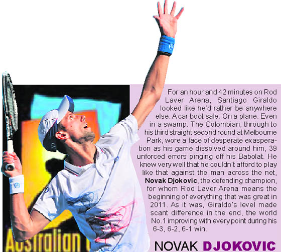 Melbourne, January 19 Defending champion Djokovic thumped Colombia's Santiago Giraldo and Williams brought up her 500th career win, against Barbora Zahlavova Strycova, to reach the third round. Former champion Maria Sharapova made it two wins for the loss of just two games, and 2008 French Open winner Ana Ivanovic also strolled through to the weekend fixtures. Second seed Kvitova had a trickier assignment against battle-hardened Carla Suarez Navarro, but she survived a mid-match meltdown to progress in three sets -- and stay on course for the top world ranking. Djokovic has been in commanding form at the year's first major as he bids to repeat last season's astonishing haul of three grand slams among 10 titles, with a 41-match winning streak along the way. And the Serb expended little energy in his 6-3, 6-2, 6-1 hit-out against Giraldo as he speeds towards an expected semi-final with Andy Murray, his victim in last year's final, who plays later. "I try to not underestimate any opponents in early rounds," Djokovic said. "Santiago came out early hitting the ball quite flat. But I knew that, you know, sooner or later he's going to drop the rhythm and I just have to hang in there. I've done a good job," he added. Williams's victory kept up her record of reaching the third round in all but one of her 47 grand slams — despite a heavy fall late in the match on her recently injured ankle. "It's fine, I just have really wobbly ankles," she said. "I wasn't meant to be a ballerina." Resurgent Sharapova, the 2008 winner, made light of her total lack of competitive tennis this year as she thrashed US qualifier Jamie Hampton 6-0, 6-1, after dispatching Giselo Dulko by an identical score in the first round. Afterwards, the Russian said being world number one — which she could achieve at the end of this tournament, along with Kvitova, Victoria Azarenka and the current incumbent, Caroline Wozniacki -- was not her priority. "My goal is to be ready for the important ones, for the big ones (tournaments)," said Sharapova, 24. "That's what matters at this stage in my career to me. I try to prepare as best as I can for them." Former finalist Jo-Wilfried Tsonga went through in straight sets against Ricardo Mello but fifth-seeded baseliner David Ferrer, who reached the semis last year, needed five to beat American Ryan Sweeting. Canada's Milos Raonic wielded his huge serve as he downed Germany's Philipp Petzschner 6-4, 5-7, 6-2, 7-5. Among the other women's results, China's Zheng Jie upset Italian seed Roberta Vinci in straight sets and Sara Errani ousted Nadia Petrova. And Cyprus's Marcos Baghdatis paid for totalling not one, not two, not three, but four racquets in a sensational tantrum during Wednesday's loss to Stanislas Wawrinka when he was fined $800. — AFP |