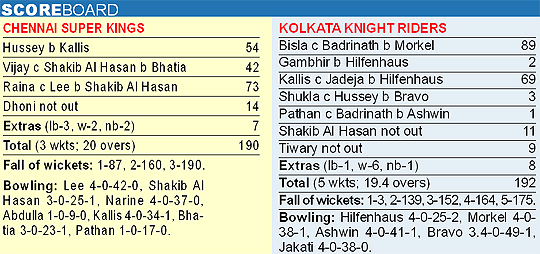 But Bisla was dismissed when he mistimed a shot off Albie Morkel and was caught by Badrinath running back from point. Yusuf Pathan and Laxmi Ratan Shukla didn't last long and it was down to Kallis keeping his nerve. After having brought them within kissing distance, Kallis fell trying to create room for hitting a boundary and was caught in the deep off the bowling of Hilfenhaus. The tension was getting unbearable but when Manoj Tiwary hit consecutive boundaries off Bravo's final over, the title had been won. KKR had lifted their first title, and Chennai would have to wait for another day! Earlier, an onslaught led by Suresh Raina and Mike Hussey ensured that the Chennai Super Kings reached 190 for three in their allotted 20 overs here tonight. Chennai won the toss and opted to bat, and they made the most of a wicket that was pretty much a batting paradise.