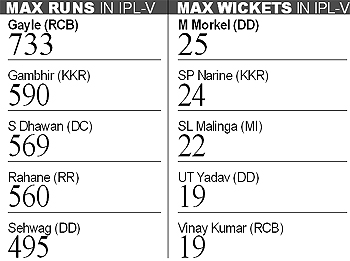 Hussey and Vijay started cautiously, but after a couple of silent overs, launched a scathing attack on the KKR bowling. It was Hussey who took charge this time around and he was particularly harsh on fellow Australian Brett Lee. But Vijay was not far behind himself, and Chennai raced to a fifty in the sixth over. The signs were ominous for KKR, and skipper Gautam Gambhir turned to his most potent weapon, Sunil Narine. But it seemed that the West Indian was not in his element as he kept dropping the ball just short of length and the Chennai opening pair played him late and with ease. The opening partnership was finally broken when Vijay was dismissed by Rajat Bhatia. Shakib taking a sharp catch to bring a little cheer to the beleaguered KKR camp. But that was all the relief that was in sight for them on the night, as Suresh Raina walked in to torment them furthermore. Raina played an action-packed knock of 73 off just 38 balls, hitting three fours and five sixes. He tore into Yusuf Pathan and was at ease against the rest of the bowling attack as well. Mike Hussey on the other hand completed a crucial fifty and he was instrumental in keeping the run flow constant. By the time he was cleaned up by a fuller Jacques Kallis delivery, Hussey had played a fine 54 off just 43 balls. MS Dhoni and Raina kept up the good work and when Suresh Raina was caught brilliantly on the boundary by a diving Brett Lee, Chennai had already reached the second highest score in an IPL final. No prizes for guessing who has the highest score. It was 205 by Chennai against Royal Challengers Bangalore in last year's final. |