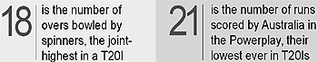 India, thus, paid for the big defeat they suffered at the hands of Australia, which made their net run-rate plummet to perilously low levels. India had scratched their way past 150, boosted by a late burst from Suresh Raina (45) and captain MS Dhoni (23 not out). South Africa lost in-form opener Hashim Amla second ball but thanks to Faf du Plessis's rapid 65 they threatened a first Super Eight victory before falling just short, Zaheer Khan claiming figures of three for 22 for India. Lakshmipathy Balaji was twice hit for six in the final over but he bowled Albie Morkel and his brother Morne to seal victory with one ball to spare. The narrow victory seemed to give Dhoni a straw to clutch at. "If you take the Australia game out, where the rain intervened, we performed brilliantly and can't have control over how other teams played," Dhoni said. "Overall, I'm quite happy with how the team performed. There were instances where we should have had 10-15 runs more on the board. We lost too many wickets early." Yuvraj Singh, with 21 runs and two wickets, was named the Man of the Match. Scoreboard India Gambhir b M Morkel 8 Sehwag b Peterson 17 Kohli c de Villiers b Kallis 2 Rohit lbw b Peterson 25 Yuvraj b M Morkel 21 Raina run out (Botha/de Villiers) 45 Dhoni not out 23 Extras: (lb 10, nb 1) 11 Total: (6 wkts; 20 ovrs) 152 Fall of wickets: 1-23, 2-30, 3-36, 4-68, 5-112, 6-152 Bowling: Steyn 4-1-26-0, Morkel 4-0-28-2, Kallis 3-0-24-1,Peterson 4-0-25-2,Botha 3-0-30-0, du Plessis 1-0-3-0, Duminy 1-0-6-0 South Africa Amla c Sehwag b Khan 0 Kallis c Sharma b Pathan 6 de Villiers b Yuvraj 13 du Plessis c Raina b Yuvraj 65 Duminy c Gambhir b Balaji 16 Behardien c Raina b Khan 13 Peterson b Khan 10 J. Morkel b Balaji 10 Botha c Raina b Ashwin 8 Steyn not out 0 M. Morkel b Balaji 6 Extras: (lb 3, nb 1) 4 Total: (all out; 19.5 overs) 151 Fall of wickets: 1-0, 2-16, 3-46, 4-95, 5-107, 6-127, 7-127, 8-138, 9-145 Bowling: Zaheer 4-0-22-3, Pathan 3-0-26-1, Yuvraj 4-0-23-2, Rohit 1-0-13-0, Ashwin 4-0-27-1, Balaji 3.5-0-37-3 |