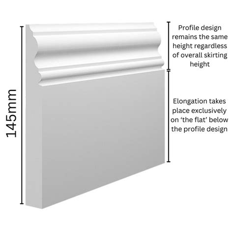 Skirting Length - We offer skirting boards in two standard lengths: The height of the shaped molding on the board. Ideal for most standard room sizes, minimising joints. The vertical measurement from the floor to the top of the board. Here's a breakdown of these dimensions: